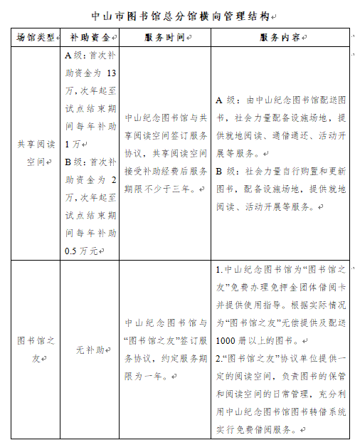 2018年中山市印发《中山市图书馆总分馆服务体系建设实施方案》,开展图书馆总分馆服务体系建设工作,经过一年多的努力至2019年建成以中山纪念图书馆为总馆、各镇(街道)图书馆为分馆、各行政村(社区)综合性文化服务中心图书室(馆)及街区自助图书馆为服务点的市、镇(街道)、村(社区)三级公共图书馆服务体系,有效实现在业务场馆、技术平台、文献资源、阅读活动、人才队伍等五方面的共建共享,有力推动全市公共图书馆事业发展和书香中山建设。2020年,为拓展公共图书馆服务模式,适应广大市民跟更多的精神文化需求,充分调动全市党政机关、企事业单位全面参与全民阅读,共同推进书香社会建设,推动全民阅读阵地建设工作向广度深度拓展,中山市开展“图书馆之友”项目创建工作,在全市各党政组织、群团单位、学校和酒店等企事业单位、学习型组织设立“图书馆之友”服务点,中山市纪念图书馆为“图书馆之友”免费办理免押金团体借阅卡并提供使用指导,根据实际情况为其无偿一次性提供及配送1000册以上的图书,并定期为“图书馆之友”更换、补充图书,保证图书质量,为广大市民提供优质的阅读服务。在全省范围内率先建设的“图书馆之友”系列嵌入式、特色化、休闲风共享阅读空间,成为中山市创建工作的一大亮点。